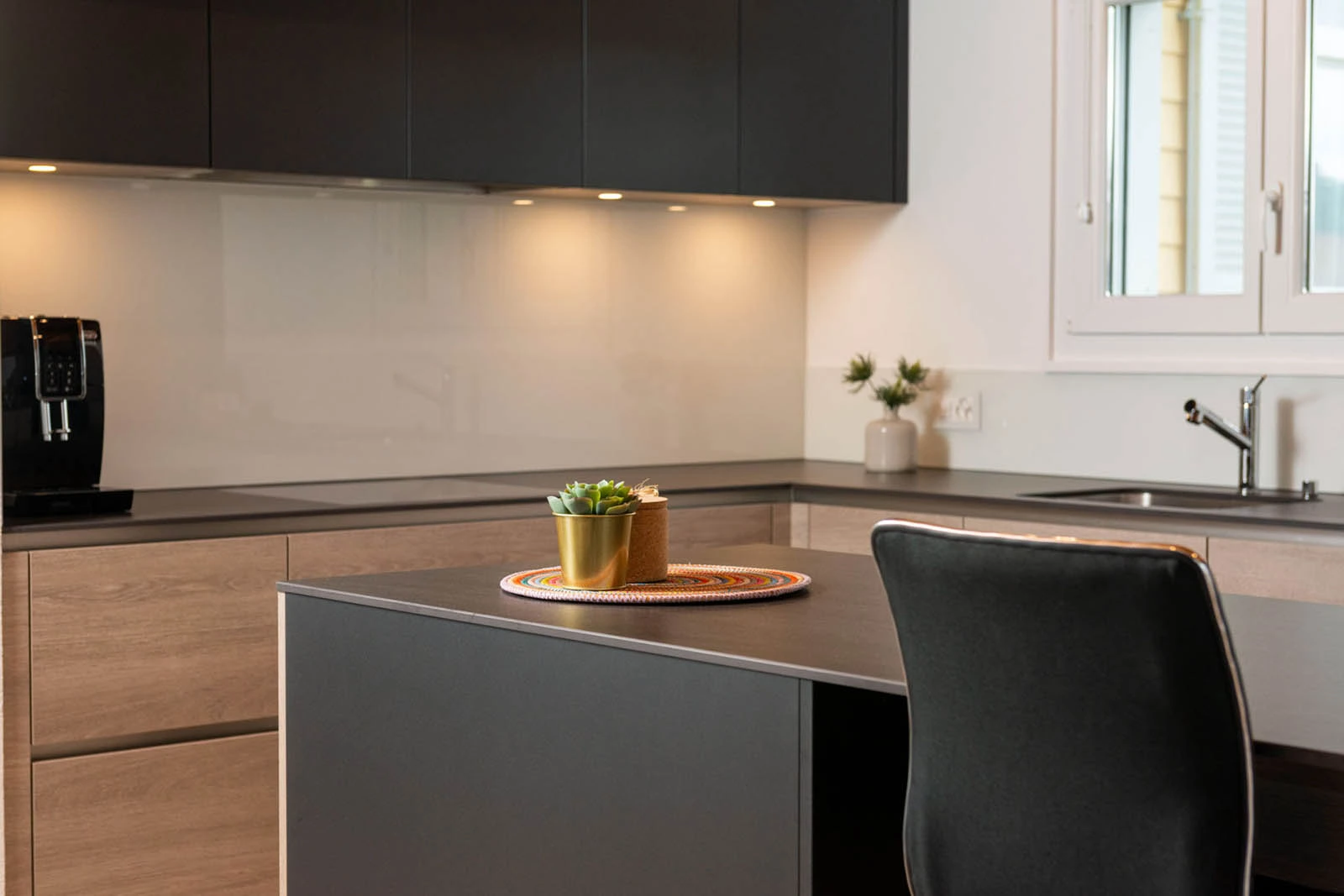 « Une cuisine réussie ne se limite pas à sa disposition : elle s'incarne dans les matières, les détails et l'aménagement. Chez APF, nous créons des aménagements cuisine où chaque plan de travail, chaque ilot central et chaque crédence sont pensés pour sublimer votre espace et faciliter votre quotidien dans nos showrooms de Nyon, Etoy et Crissier. »